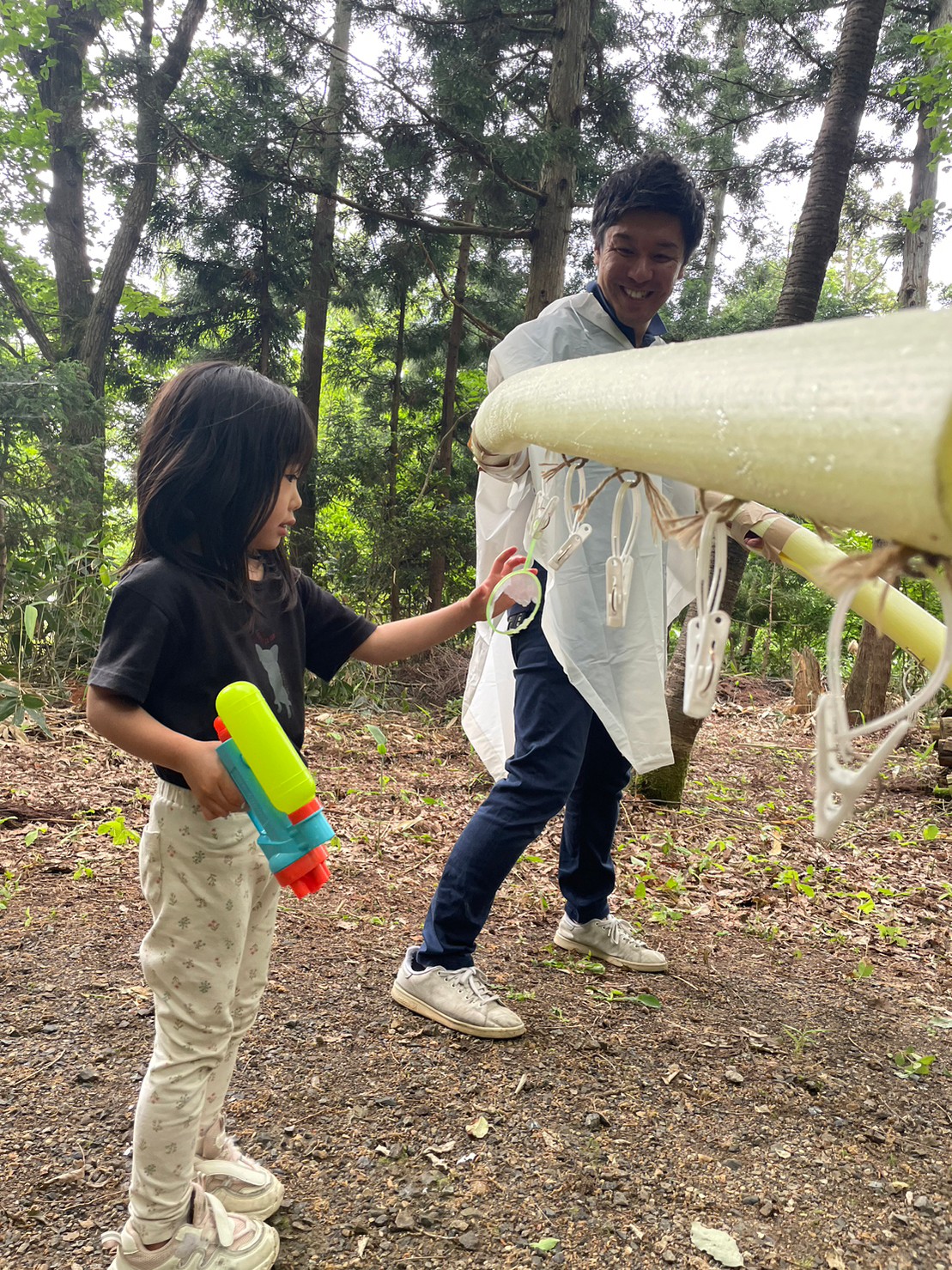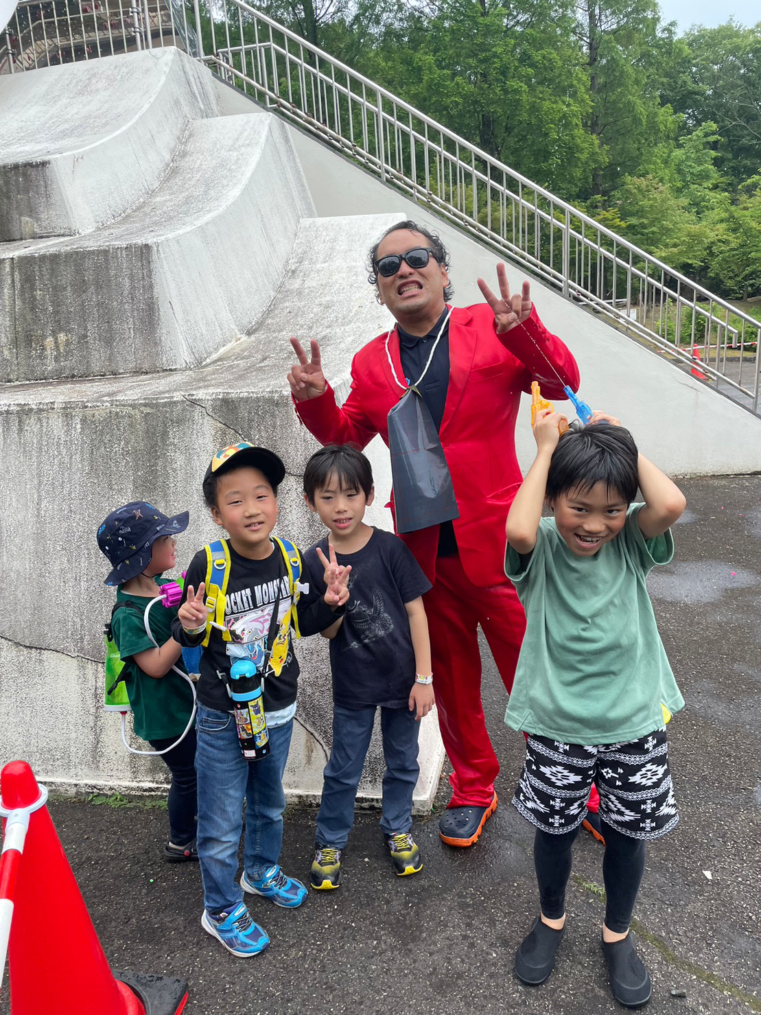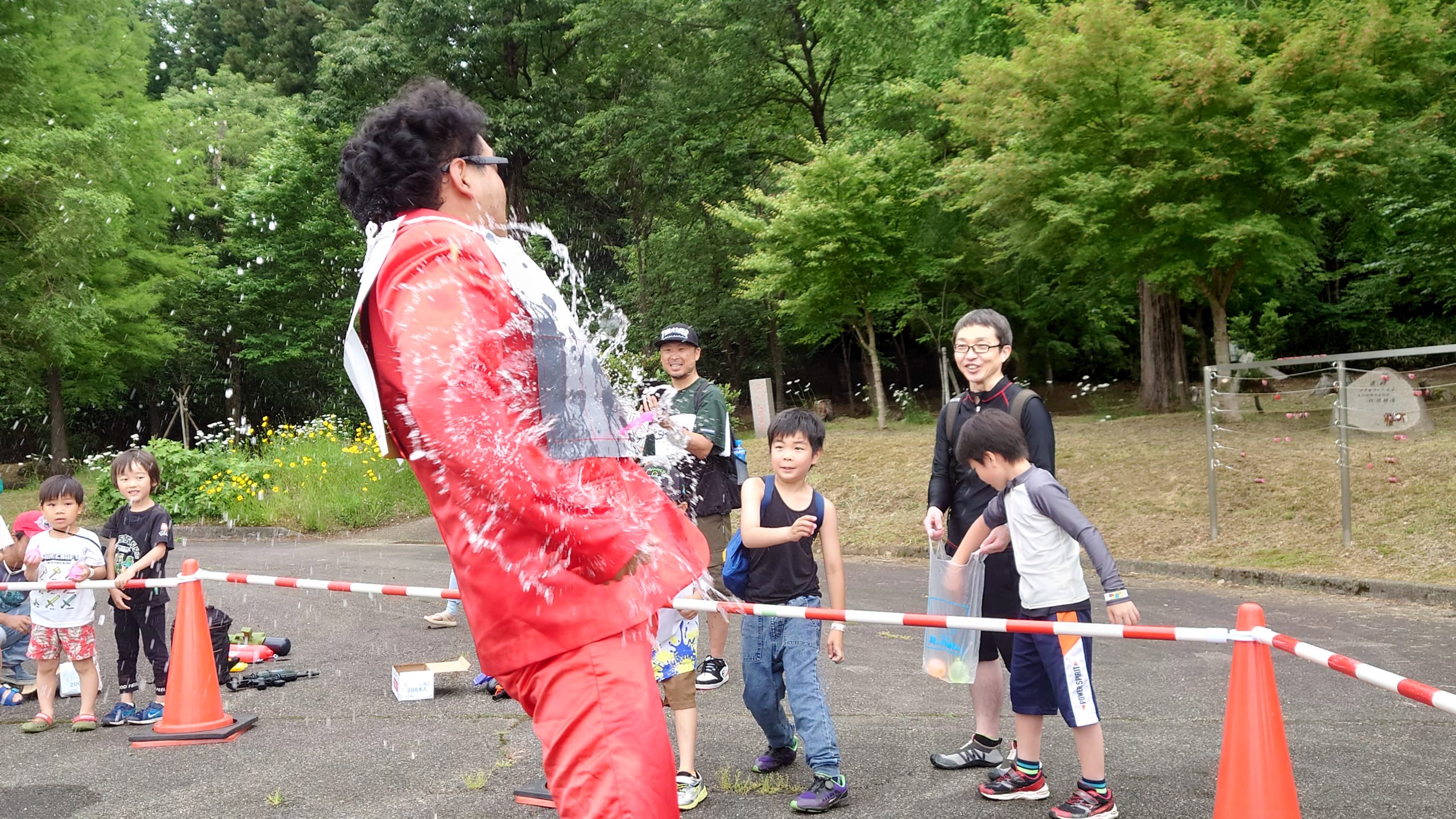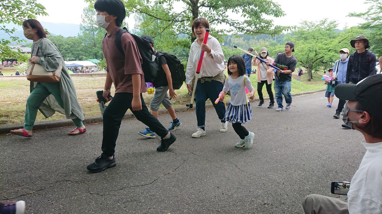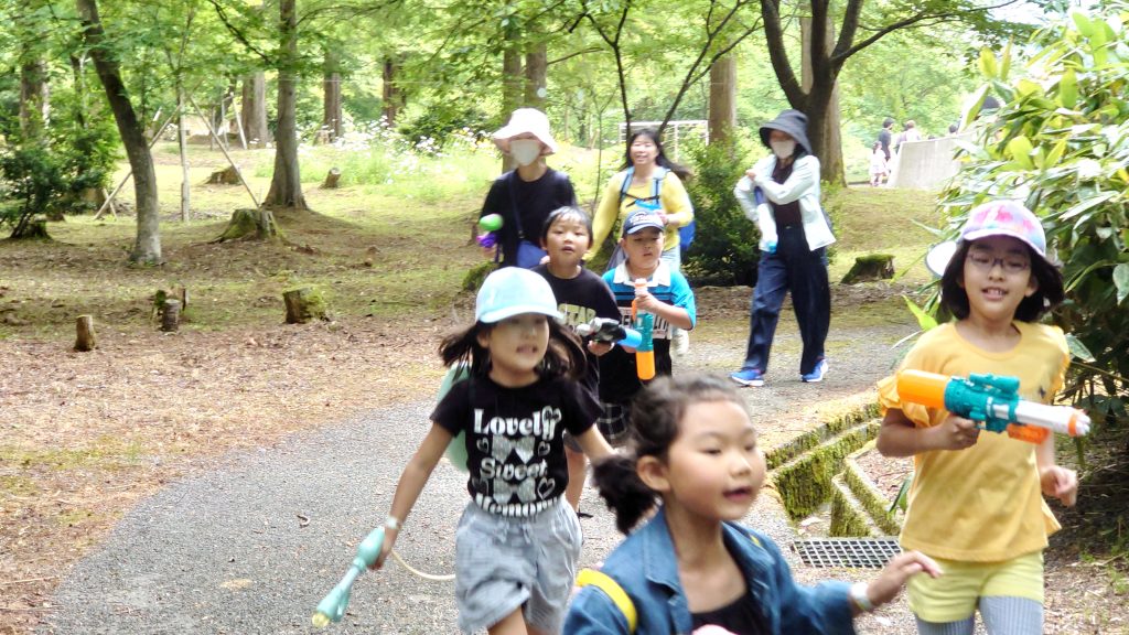 ゲームの内容は月岡カリオンパーク内の各地に設置された的(ポイ)を水鉄砲で撃ち抜いて、獲得したポイの数を競うというもの。スタートの合図とともに一斉に走り出す子供たち!一緒に参加したお父さんお母さんも子供たちを追いかけて走ります!