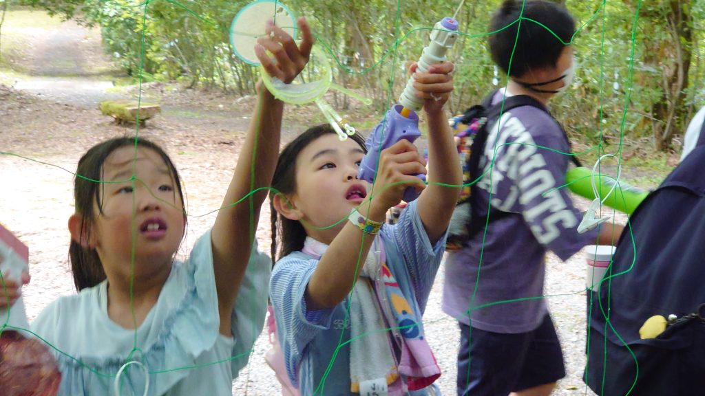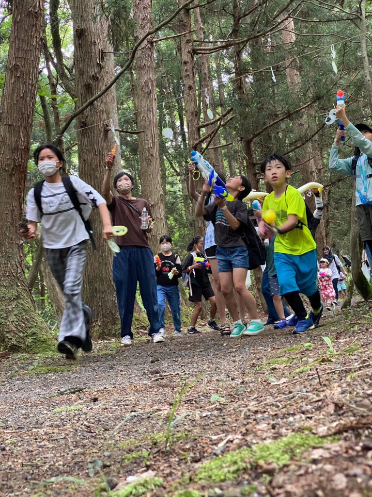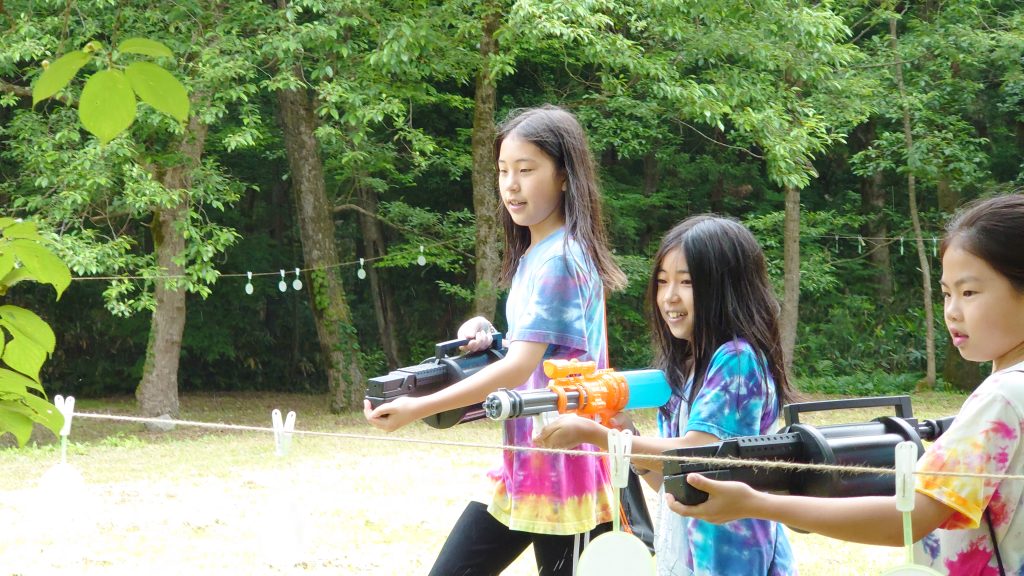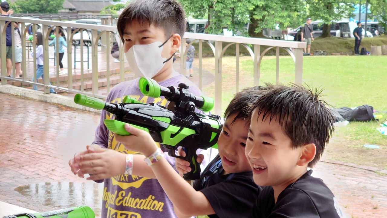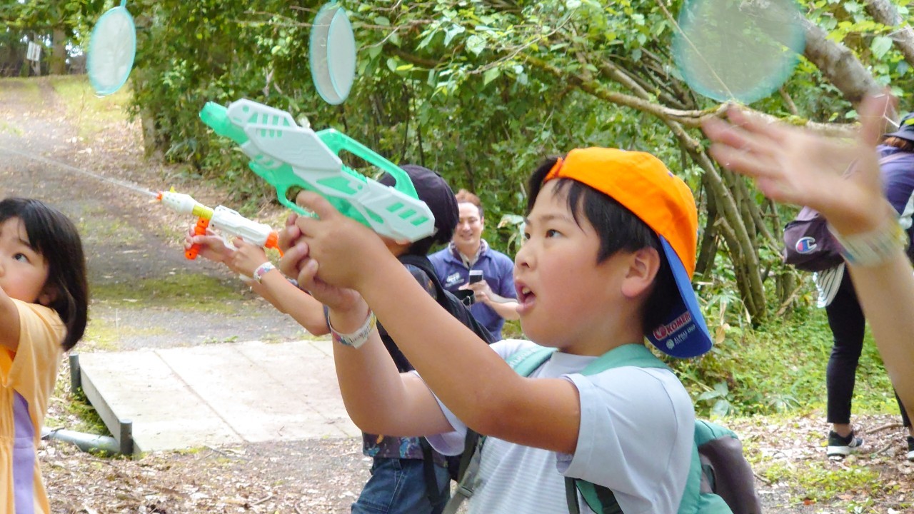 次々に的を打ち抜いていく子供たち。的はただぶら下がっているものもあれば、各地にいるボスが動かしている的もあり、狙うのに苦労している様子でした。それでもみんな楽しそうに走り回って水鉄砲を撃っていきます。