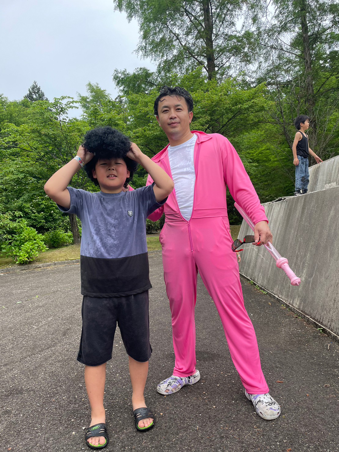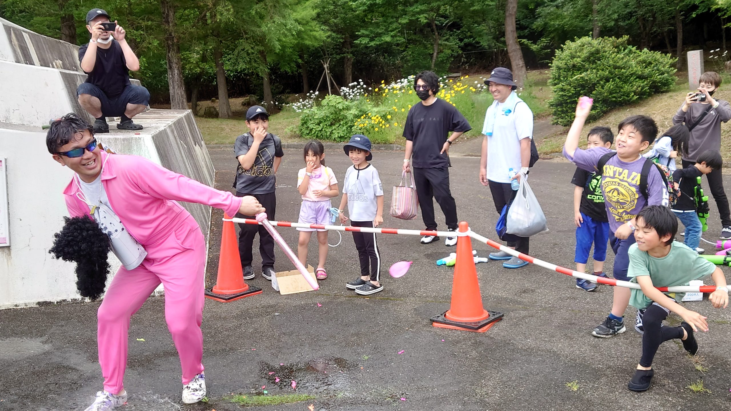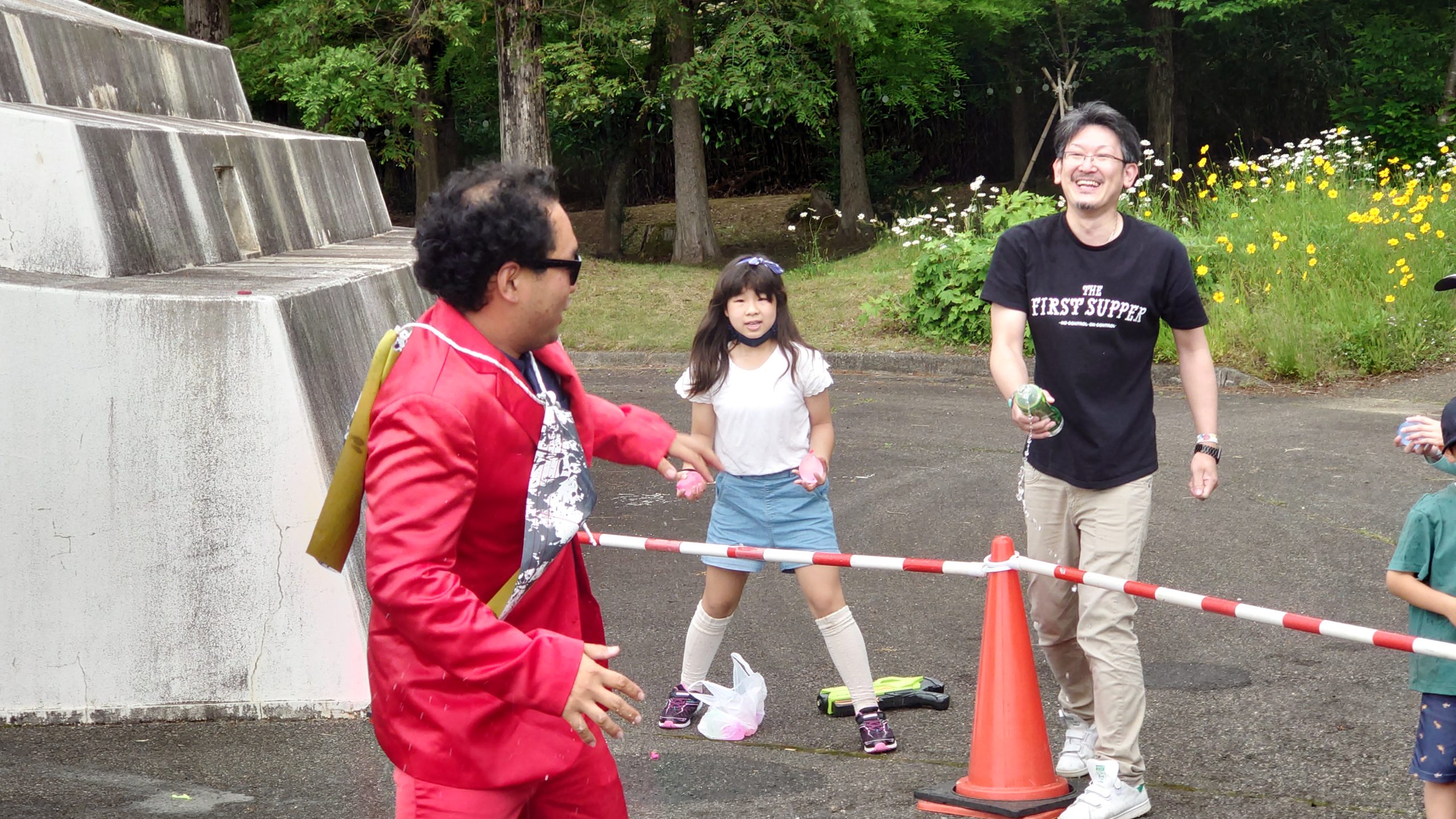 ゲームの締めくくりはラスボスとのエキシビジョンマッチです。獲得した的の数に応じて水風船をもらい、カリオンタワーから現れるラスボスめがけて、みんなで一斉に投げつけます!たくさんの子供たちの相手をして、ラスボスはすっかり水浸しになっていました。