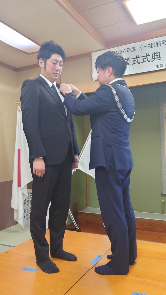 感謝状授与が終わると、今年度の理事長、専務理事、筆頭副理事長から次年度の理事長、専務理事、筆頭副理事長へバッジの交換、理事長予定者へプレジデンシャルリースの伝達を行いました。