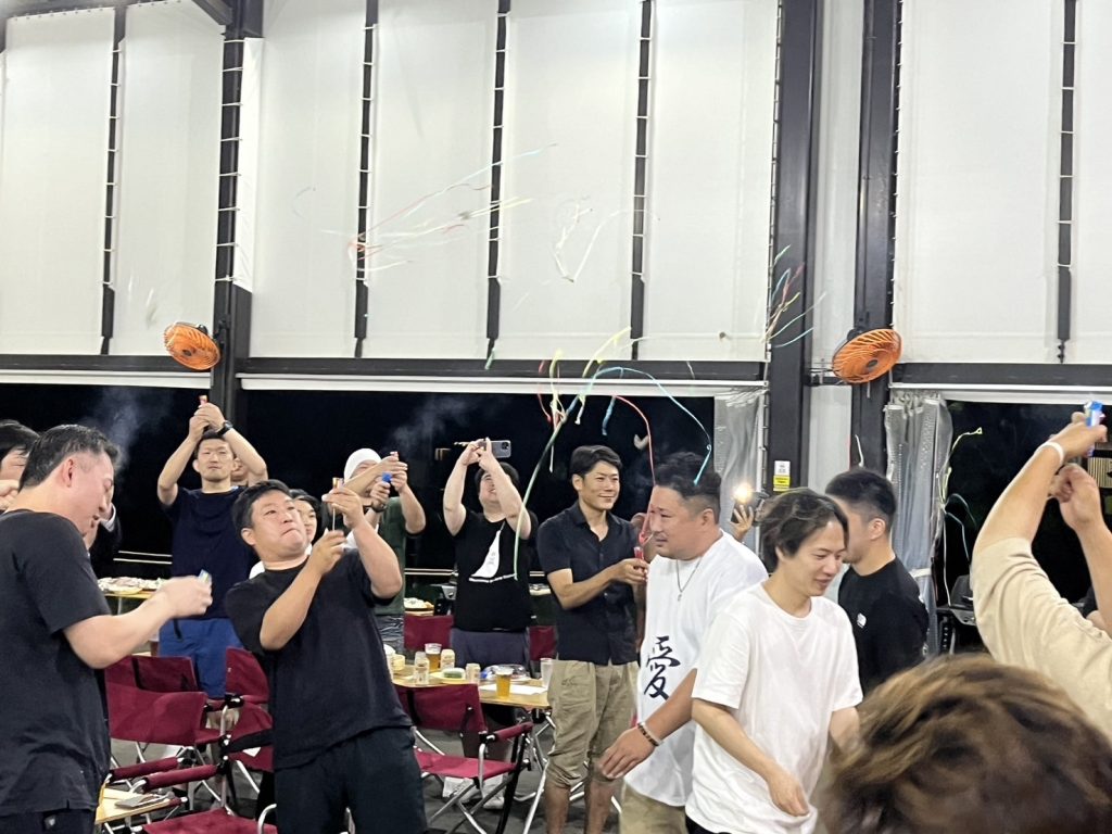 その後は激励会をいじみのバーベキュー王国で行いました。激励会では桑野理事長予定者のプロフィール映像を視聴し新入会員にもわかりやすく紹介をしました。その後はサプライズの激励映像やメンバー一人ひとりからの激励サイン、花束・プレゼント贈呈などを行い桑野理事長予定者をメンバー全員で激励しました。
